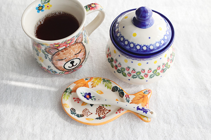 小さな撹拌用のスプーン。ミルクやお砂糖を混ぜるために、カップ&ソーサーに添える時にはぴったりです。浅いカーブなので、混ぜて使うドレッシングやタレに添えるのもおすすめ。ポーリッシュポタリーらしく、表だけでなく裏にも丁寧に絵付されています。