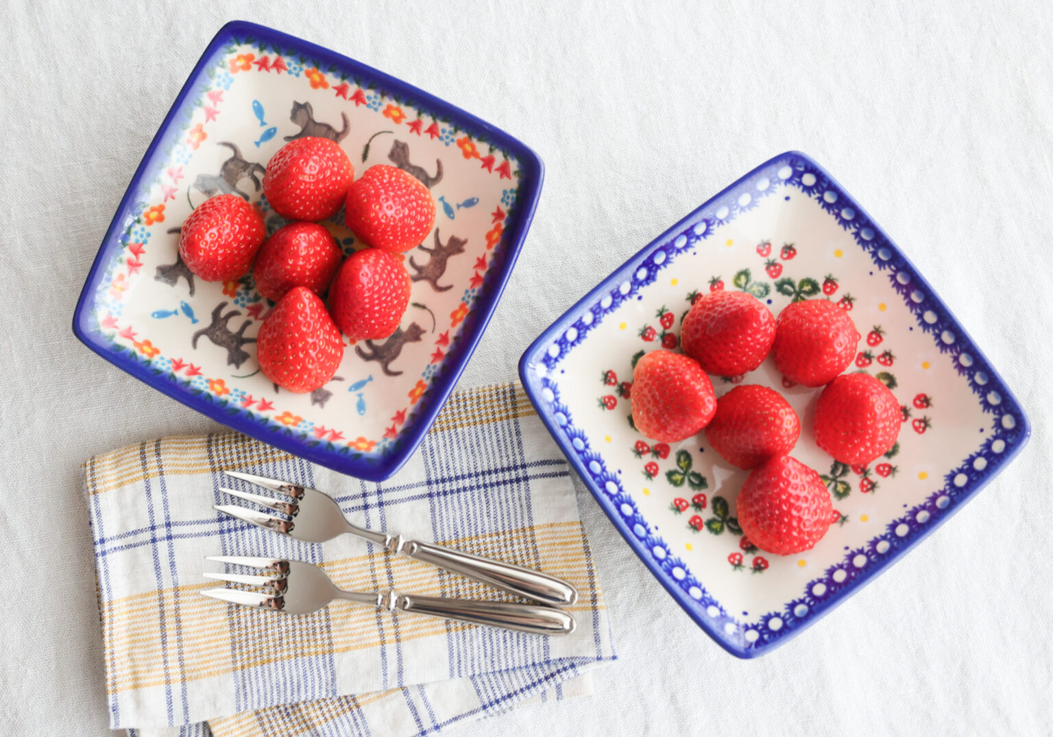 ポーランドでもいちごはとても好まれる身近な果物です。リアルな葉っぱの形状と、小さないちごがあどけない印象のパターンデザインは、素朴でほっこりした心和む雰囲気です。