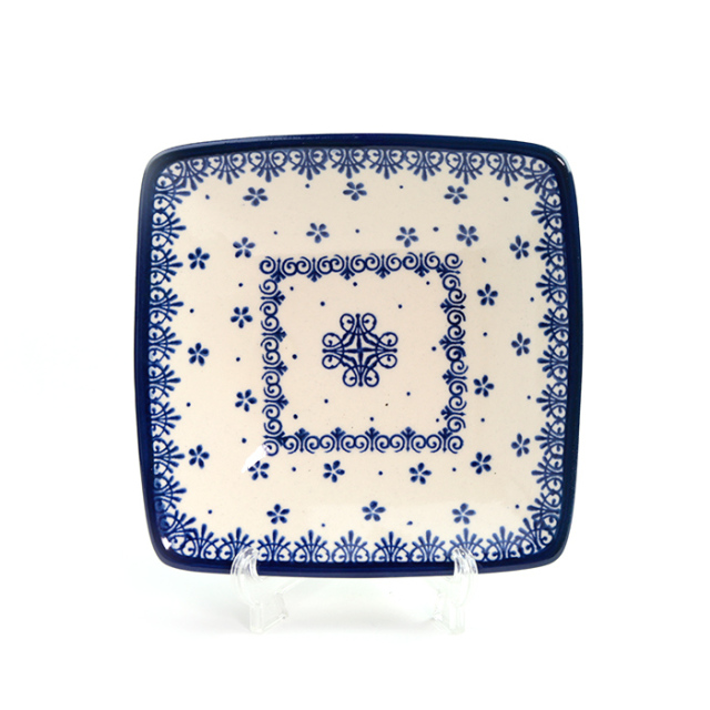 ポーリッシュポタリーの素地であるクリーム色と大変馴染みの良い紺色が使われたパターンデザイン。シンプルなスタンプ柄で、飛び梁や尖塔を思わせるゴシック的な雰囲気も漂っています。何を盛り付けてもさまになる上品な美しさがこの柄の最大の魅力です。