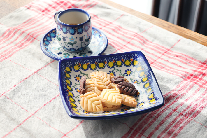 ケルセンでは定番のU006柄の青いスタンプを黄色に置き換えたようなパターンデザイン。グリーンの蔓で結ばれた花が愛らしく、青と黄色のコントラストが独特な雰囲気を出しています。VENA社のヴロツワフの直営店でも人気の絵柄だそうです。