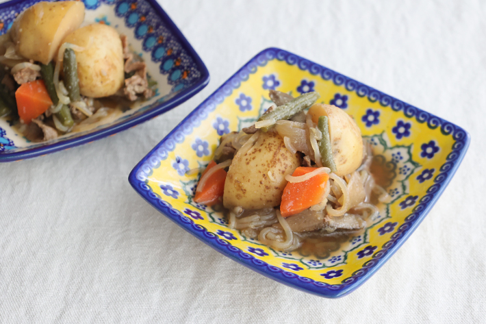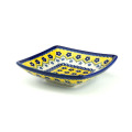 濃い黄色とくっきりとした紺色のスタンプで構成された意匠は、ポーリッシュポタリーの多数派である藍色ベースの配色とはちょっと違った雰囲気です。緑色で縁取りされた白い部分がレースのように見え、この柄のお洒落なアクセントになっています。