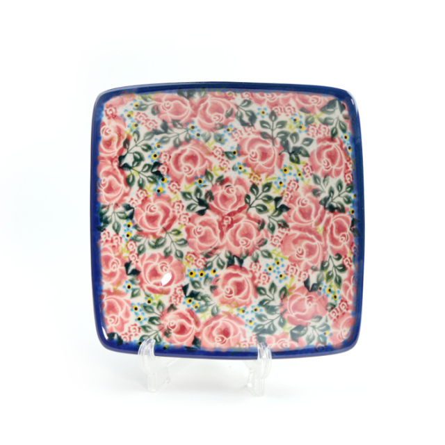 青い薔薇のデザイン(624)との色違いです。よく見ると赤い薔薇は大小2種類で、枝葉と共に隙間なく散りばめられ一層華やかな雰囲気が伝わってきます。青い薔薇のデザイン同様、紺色で縁取られることにより二つの柄の統一感が与えられています。