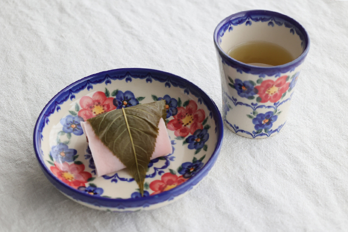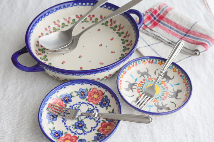 直径は約13.5cmの少し深さのある器です。日本で銘々皿として使われているものと同じようなフォルムをしています。ポーリッシュポタリーらしく、外側にも絵付けされている美しく手の込んだ仕上がりです。スタッキング性にも優れ、複数枚でのご利用がおすすめ。柄違いで使うポーリッシュポタリーの楽しみ方にも馴染む器です。ザクワディの銘々皿(直径14cm)とほぼ同じようなフォルムなので、重ねてもそれほど違和感は感じられません。