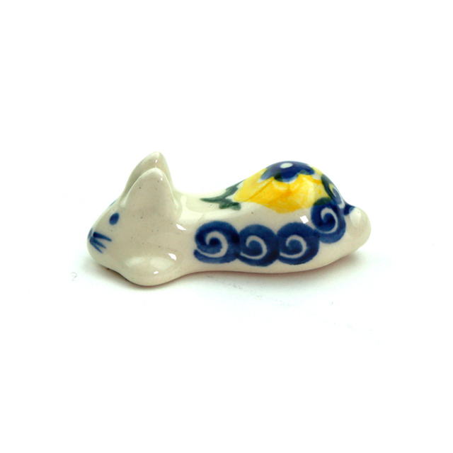 濃い黄色とくっきりとした紺色のスタンプで構成された意匠は、ポーリッシュポタリーの多数派である藍色ベースの配色とはちょっと違った雰囲気です。緑色で縁取りされた白い部分がレースのように見え、この柄のお洒落なアクセントになっています。