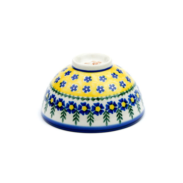 黄色の配色による元気で楽しいイメージの絵柄です。遠目から見ても目立つ印象的なスタンプワークがこの柄の魅力。黄色の中にあるポーリッシュポタリーらしい紺色の小さな花柄のスタンプは、どこかあどけない雰囲気で、可愛らしさの源になっています。