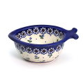 縁取りに使われている8つの花弁の花柄スタンプは、ポーリッシュポタリーのスタンプの中でも最もポピュラーなもののひとつ。クリーム色の余白の部分には、青い小花とドットがあしらわれています。比較的シンプルな構成ながら、バランスの取れたデザインであり、清楚な愛らしい雰囲気に包まれています。