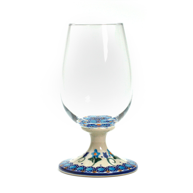 ガラス製のボウルに、ポーリッシュポタリー製のステムとプレートが組み合わさったグラス。満水時には600CC入る大きめなサイズは、エレガントにワインを楽しんだり、泡立つビールにも安心してご利用いただける懐の深さです。