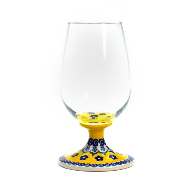 ガラス製のボウルに、ポーリッシュポタリー製のステムとプレートが組み合わさったグラス。満水時には600CC入る大きめなサイズは、エレガントにワインを楽しんだり、泡立つビールにも安心してご利用いただける懐の深さです。