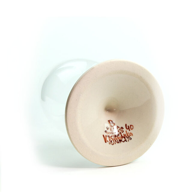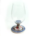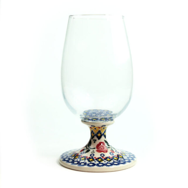 ガラス製のボウルに、ポーリッシュポタリー製のステムとプレートが組み合わさったグラス。満水時には600CC入る大きめなサイズは、エレガントにワインを楽しんだり、泡立つビールにも安心してご利用いただける懐の深さです。
