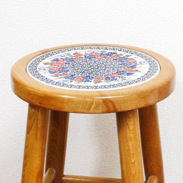 ブナ(ビーチ)材のスツールの座面に、ポーリッシュポタリーの陶器製の大きめの丸いタイルが埋め込まれた椅子。大人が問題なく座れる丈夫なつくりとなっています。ソファの傍に置いて小さなカフェテーブルのように使うのもおすすめです。 *手作りスツールのため、木材の表面はラフな仕上がりとなっています。