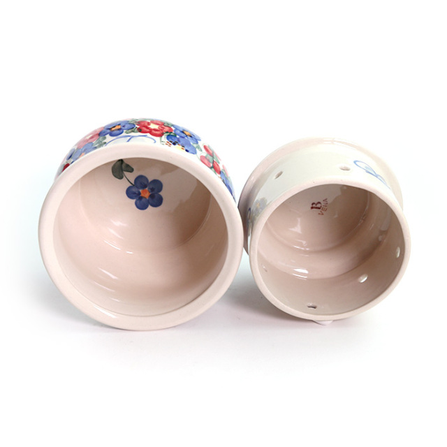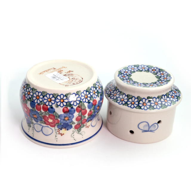 冷蔵庫の無い時代のフランスが発祥と言われている、バターを常温保存するための容器です。冷蔵庫保存の固いバターではなく、クリーミーな状態のものをパンに塗ることができる優れもの。上に被さっている穴の開いたカップに常温で柔らかくなったバターを詰め、下のカップ部分に水を入れて、空気を遮断して保存する仕組みです。