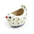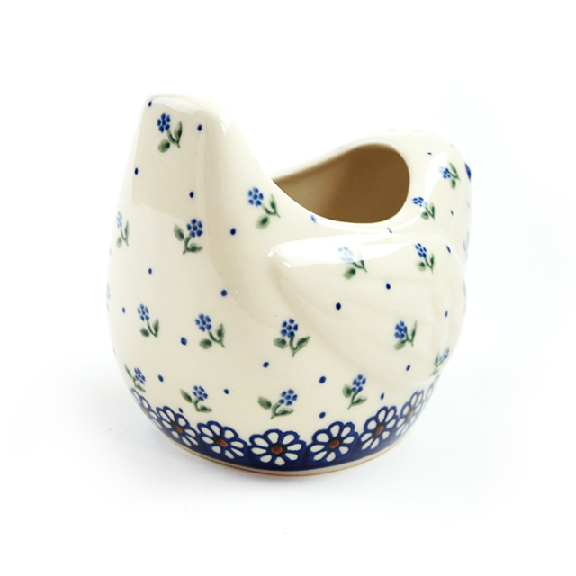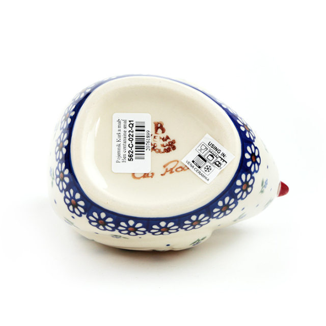 縁取りに使われている8つの花弁の花柄スタンプは、ポーリッシュポタリーのスタンプの中でも最もポピュラーなもののひとつ。クリーム色の余白の部分には、青い小花とドットがあしらわれています。比較的シンプルな構成ながら、バランスの取れたデザインであり、清楚な愛らしい雰囲気に包まれています。