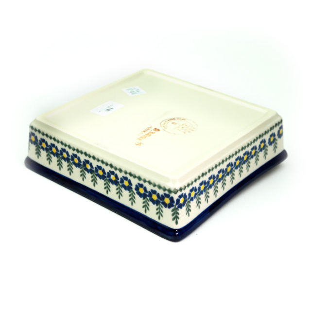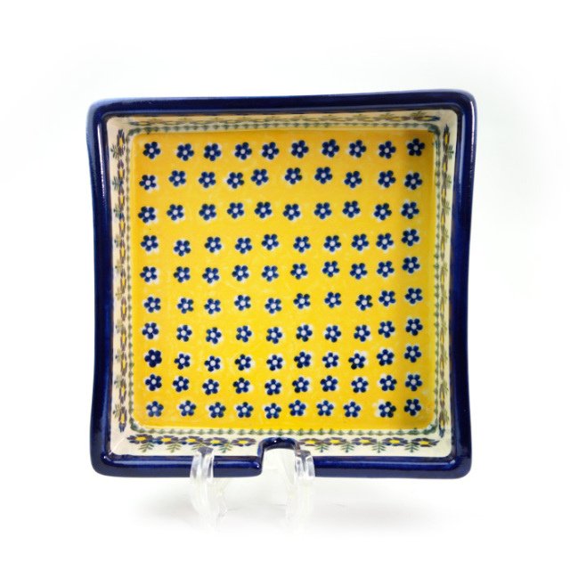 黄色の配色による元気で楽しいイメージの絵柄です。遠目から見ても目立つ印象的なスタンプワークがこの柄の魅力。黄色の中にあるポーリッシュポタリーらしい紺色の小さな花柄のスタンプは、どこかあどけない雰囲気で、可愛らしさの源になっています。