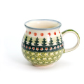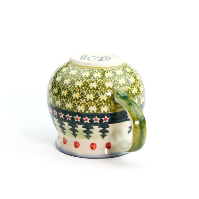 もみの木がモティーフになっているクリスマスにぴったりのデザインです。もみの木のスタンプがとてもWIZA社らしい味を出しています。ポーリッシュポタリーに用いられる色としては比較的少ないグリーン系の配色で、赤いドットがとても効果的に配置されているところも素敵です。眺めているうちに心が和んでくる素朴な温もりに包まれています。