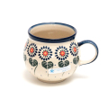ひまわりを意匠化したどこかノスタルジックな雰囲気も漂うパターンデザインです。手描きされた葉っぱをもたげた茎の部分が、ポーリッシュポタリーならではのアクセントになっています。比較的シンプルなスタンプの連続がリズム感を生み、ポップな明るさを印象付けました。