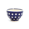 ポーリッシュポタリーの伝統柄であるピーコックアイと似ている、紺地に白いドットのパターンデザインです。実は素地がクリーム色で、このスタンプは平面の海綿を丸くくり抜いて作られています。ドットに見えることによって、ポップな印象になるところが面白いですね。