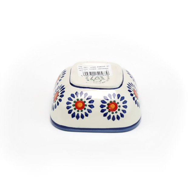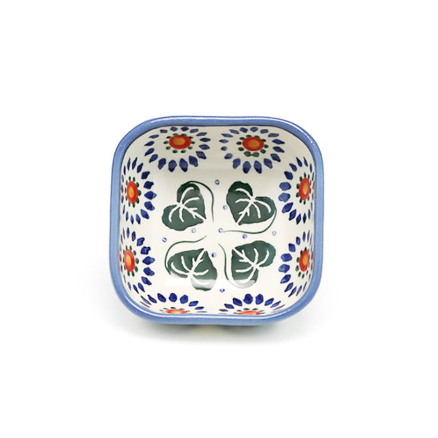 ひまわりを意匠化したどこかノスタルジックな雰囲気も漂うパターンデザインです。手描きされた葉っぱをもたげた茎の部分が、ポーリッシュポタリーならではのアクセントになっています。比較的シンプルなスタンプの連続がリズム感を生み、ポップな明るさを印象付けました。