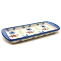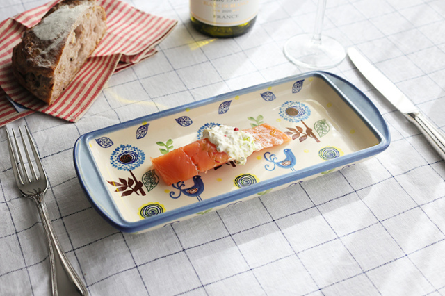 長方形の平たいトレイ。オードブルのように横並びにお料理を盛り付けたり、天ぷらを盛り合わせたり、長細いお魚を盛り付けたり、とうもろこしやメロンやスイカなど果物を乗せたり、調味料を並べ置いたり、・・・様々な用途が考えられる楽しいお皿です。少し深さもあるので、ちょっと汁気のあるお料理にも対応できます。長方形のダイニングテーブルの中央にも置きやすく納まりが良いトレイです。