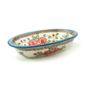 両縁の部分に1cm程度の羽があり、熱くなったお皿をミトンで運ぶときにも抱えやすくなっています。適度な深さで使い勝手も抜群。容量的には、一人分のグラタンなどに丁度良いサイズです。葡萄や西瓜などフルーツを装ったり、様々にご利用いただけます。