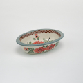 WIZA社製の可愛らしいオーバルデッシュ。淡い深緑の葉と、赤より薄い朱色の花を中心にした、WIZA社の新しいパターンデザインのひとつです。縁取りの茶色のスタンプがこの柄のアクセントになっています。