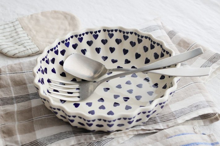 側面が波打っているスフレディッシュという名前の食器です。焼きっぱなしのケーキ、パイ、キッシュや、グラタンやドリアなどを焼いたりできます。深さもあるので、ボウルのようにサラダやおかずを盛り付けても大丈夫。厚ぼったいので重みもありますが、ハンドメイドならではの温かみを存分に感じられるWIZAらしいフォルムです。ケーキ、タルト、ムース、キッシュ、プディングなどを作ってそのままテーブルへ運ぶのもおすすめ。とても素敵なケーキ型にもなり、多様な用途を持つ食器の一つです。