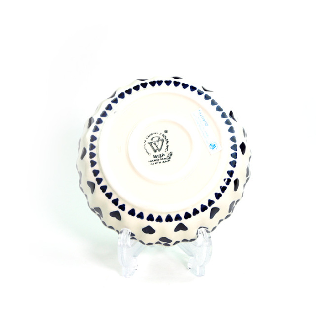 クリーム色の素地に紺のハートのスタンプがシンプルで可愛らしいデザインです。ハートの角が尖っていないところが、柔らかく優しい雰囲気を出しています。縁取りをしている小さなハートが特にこの柄を愛らしく印象付けています。