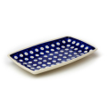 小さめの長方形のお皿。いわし、ししゃも、そして鮭など切り身のお魚が無理なく置けるサイズ感です。高台部分までなだらかに深さをとってあるので、いわしの梅煮など多少煮汁がある料理にも安心です。小ぶりで重ねやすくスペースをとらないところも◎。卵焼きを切って置いたり、和食器としての使い方が似合うポーリッシュポタリーです。