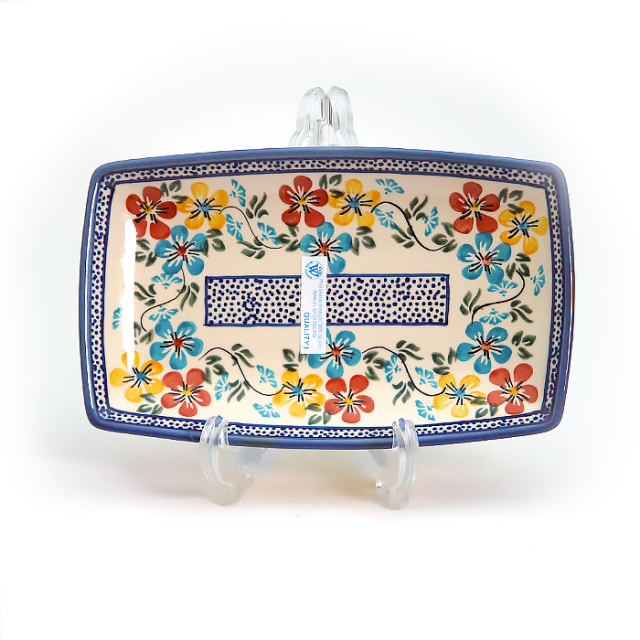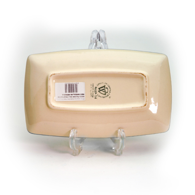 小さめの長方形のお皿。いわし、ししゃも、そして鮭など切り身のお魚が無理なく置けるサイズ感です。高台部分までなだらかに深さをとってあるので、いわしの梅煮など多少煮汁がある料理にも安心です。小ぶりで重ねやすくスペースをとらないところも◎。卵焼きを切って置いたり、和食器としての使い方が似合うポーリッシュポタリーです。
