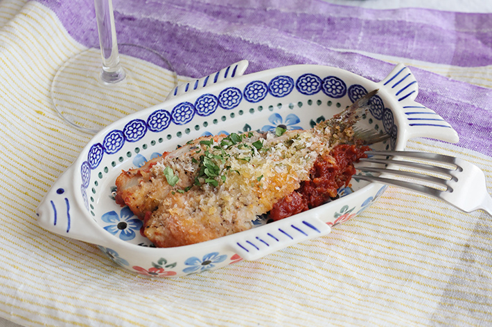 おさかなのディテール(頭、ひれ、尾)部分にこだわりを感じる見ているだけで楽しくなるユニークなフォルムがこのお皿の最大の魅力。目やエラもひとつひとつ手描きなので、筆の入れ方には個体差もあります。小さな違いはWIZA社の絵付け職人それぞれの方のユーモアですね。オーブン利用の時は、頭と尾ひれをミトンで持つと抱えやすくなっています。