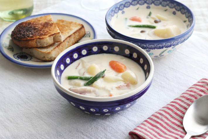 ボウルの内側(見込み)にも絵付けがされているポーリッシュポタリーらしいボウルです。外側の縁は帯状に垂直な作りで、このフォルムにスタイリッシュな印象を与えています。銘々のスープやシチュー、サラダ、シリアルなどの用途にぴったりで、重ね易い形状のため複数枚でのご利用でもすっきり収納できます。