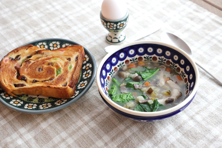 ボウルの内側(見込み)にも絵付けがされているポーリッシュポタリーらしいボウルです。外側の縁は帯状に垂直な作りで、このフォルムにスタイリッシュな印象を与えています。銘々のスープやシチュー、サラダ、シリアルなどの用途にぴったりで、重ね易い形状のため複数枚でのご利用でもすっきり収納できます。