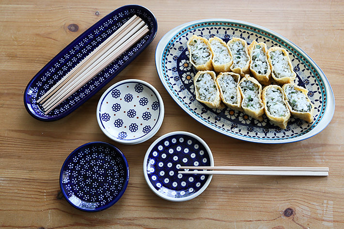 このタイプの大皿は、1枚はあると何かと重宝します。ざっくりと何かを盛っておく、例えば茹でたてのカニやトウモロコシ、大人数分の餃子、スイカやメロンも切って盛っておけばあとはご自由にお取りください、という便利さです。スーパーなどでパック売りされている握り寿司や、カットされたケーキなどを幾つも並べる時に、パックやケーキ箱からこの大皿に移し替えるだけでも気分がガラッと変わります。