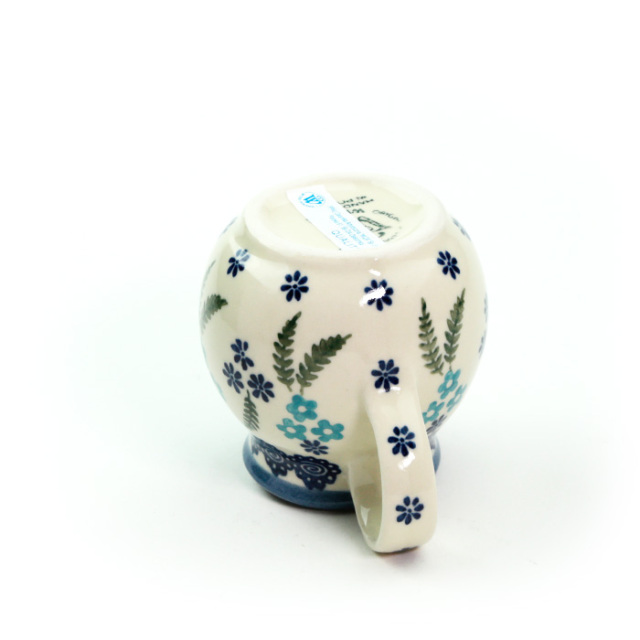白地をベースに水色と紺色の小花がちりばめられ、シダを思わせる黄緑の細やかな葉模様と美しく調和しています。清らかな配色によって楚々とした雰囲気を持つパターンデザイン。スタンプの量や色数を抑えた、バランスの取れた絵柄です。