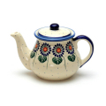 ひまわりを意匠化したどこかノスタルジックな雰囲気も漂うパターンデザインです。手描きされた葉っぱをもたげた茎の部分が、ポーリッシュポタリーならではのアクセントになっています。比較的シンプルなスタンプの連続がリズム感を生み、ポップな明るさを印象付けました。