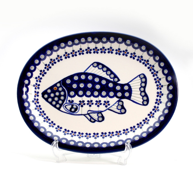 ザクワディを代表するパターンデザイン(166A) をモティーフとしたおさかなのデザインは、特に魚料理を楽しく美味しそうに見せてくれそう。お刺身やカルパッチョ、また伊勢海老やオマール海老、大きな蟹などに合わせたくなります。ポーリッシュポタリーらしさに溢れた絵画的で個性的な意匠です。