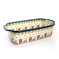 ポーリッシュポタリーらしく外側と内側に丁寧に絵付けされた焼き型です。見た目の美しさだけではなく、熱の回りが緩やかで均一に伝わるためにムラなく焼き上がるという陶器製の特長も持っています。パンなら丁度1斤分の容量です。パウンドケーキ、ミートローフなど焼き上がりをそのままテーブルに出して、またテリーヌなど冷製の型として、この器を楽しんでください。