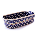 ポーリッシュポタリーらしく外側と内側に丁寧に絵付けされた焼き型です。見た目の美しさだけではなく、熱の回りが緩やかで均一に伝わるためにムラなく焼き上がるという陶器製の特長も持っています。パンなら丁度1斤分の容量です。パウンドケーキ、ミートローフなど焼き上がりをそのままテーブルに出して、またテリーヌなど冷製の型として、この器を楽しんでください。