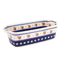 ポーリッシュポタリーらしく外側と内側に丁寧に絵付けされた焼き型です。見た目の美しさだけではなく、熱の回りが緩やかで均一に伝わるためにムラなく焼き上がるという陶器製の特長も持っています。パンなら丁度1斤分の容量です。パウンドケーキ、ミートローフなど焼き上がりをそのままテーブルに出して、またテリーヌなど冷製の型として、この器を楽しんでください。