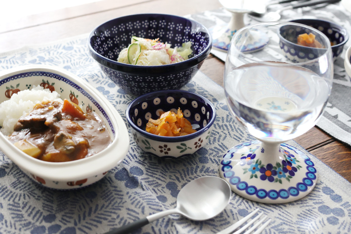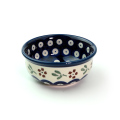 ポーリッシュポタリーの伝統的な「ピーコックアイ」と桜やコスモスを思わせる花のスタンプが組み合わさったハイスタンダード柄。絞られた色数と配色で、愛らしさがプラスされたバランスの良いパターンデザインです。同じくピーコックアイが用いられた166Aの柄と揃えて使う方も多く、組み合わせて贈り物としてのご利用もおすすめです。