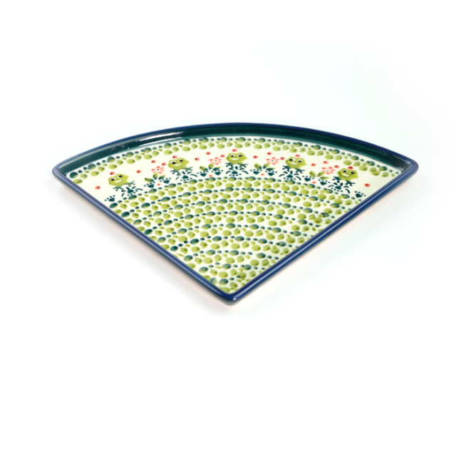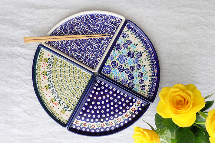 Lサイズ(35cm前後)のピザが1/4乗せられる、というユニークなフォルムが楽しいプレート。宅配ピザの取り分け用には勿論、4枚使って大きな円を描くような使い方や、扇形をイメージして和食に使うなど、アイデア次第でとても素敵なテーブルを演出できる優れもの。フラットなプレートで重ねやすいことも特長です。