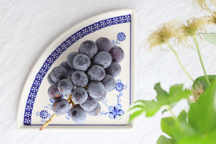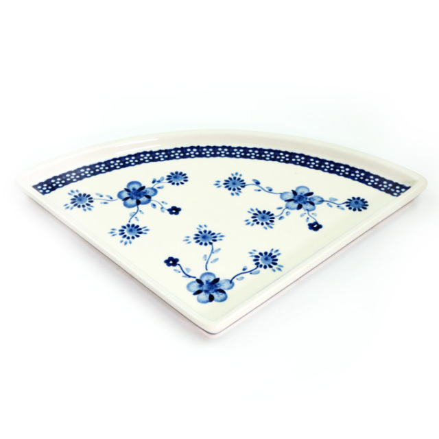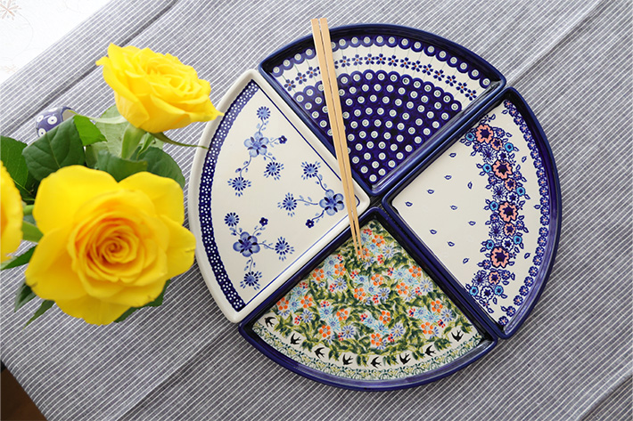 Lサイズ(35cm前後)のピザが1/4乗せられる、というユニークなフォルムが楽しいプレート。宅配ピザの取り分け用には勿論、4枚使って大きな円を描くような使い方や、扇形をイメージして和食に使うなど、アイデア次第でとても素敵なテーブルを演出できる優れもの。フラットなプレートで重ねやすいことも特長です。