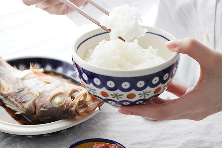 もともとは、韓国からのオファーで作られたご飯茶碗だと聞いています。内側に絵付けはなく、高台は少し低めです。見た感じの大きさは、VENA社で作ってもらったご飯茶碗の大と小の中間くらいですが、器の膨らみを考えると大きいほうと同じくらいです。ポーリッシュポタリーの老舗製造元の柄を楽しみたい方に特におすすめです。