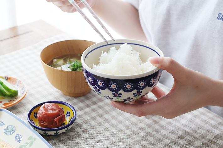 もともとは、韓国からのオファーで作られたご飯茶碗だと聞いています。内側に絵付けはなく、高台は少し低めです。見た感じの大きさは、VENA社で作ってもらったご飯茶碗の大と小の中間くらいですが、器の膨らみを考えると大きいほうと同じくらいです。ポーリッシュポタリーの老舗製造元の柄を楽しみたい方に特におすすめです。