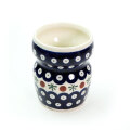 英名は「バスルームマグ」。洗面台で歯磨きの時に使用するマグとしてデビューした新しいフォルムデザインです。手に掴みやすく滑りにくい機能美に富んだ構造をしています。クールで冷たい雰囲気になりそうなバスルームを、ポーリッシュポタリーの愛らしい絵柄が和ませてくれます。勿論、変わった形のマグとしてドリンクのために使っても楽しめます。