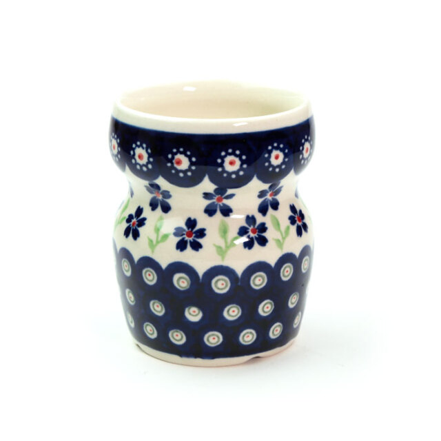 英名は「バスルームマグ」。洗面台で歯磨きの時に使用するマグとしてデビューした新しいフォルムデザインです。手に掴みやすく滑りにくい機能美に富んだ構造をしています。クールで冷たい雰囲気になりそうなバスルームを、ポーリッシュポタリーの愛らしい絵柄が和ませてくれます。勿論、変わった形のマグとしてドリンクのために使っても楽しめます。