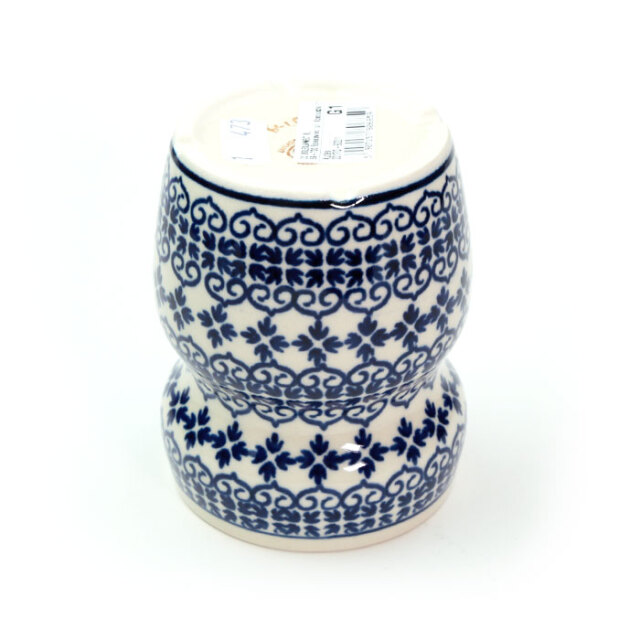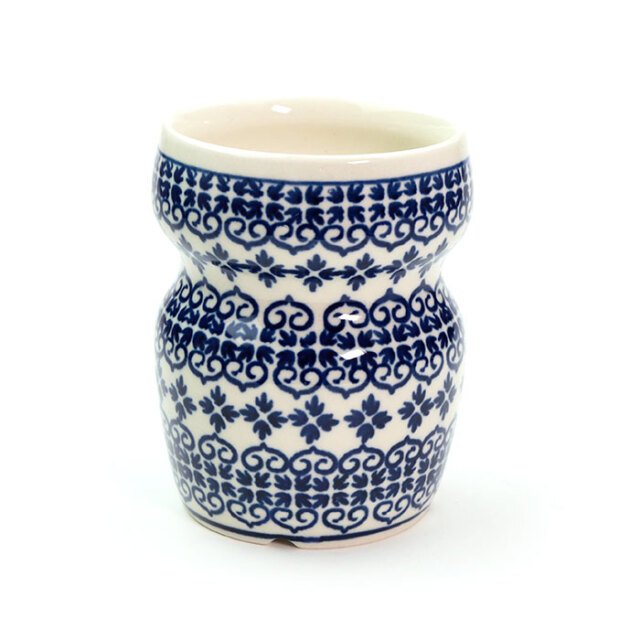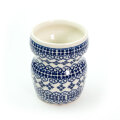 英名は「バスルームマグ」。洗面台で歯磨きの時に使用するマグとしてデビューした新しいフォルムデザインです。手に掴みやすく滑りにくい機能美に富んだ構造をしています。クールで冷たい雰囲気になりそうなバスルームを、ポーリッシュポタリーの愛らしい絵柄が和ませてくれます。勿論、変わった形のマグとしてドリンクのために使っても楽しめます。