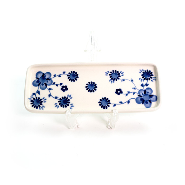 丁度メガネが置ける位の幅の水平な面を持つ小サイズのトレイです。豆鉢のような小さな器を乗せたり、お醤油や酢の瓶を乗せたりすることも出来ます。すっきりした整ったフォルムの印象と、ポーリッシュポタリーの優しい絵柄とのコンビネーションが独特の味わいを出していると思います。