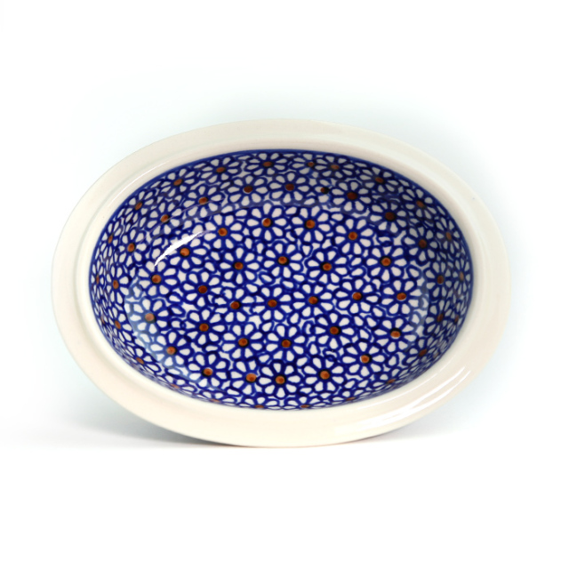 古くからポーリッシュポタリーではよく見られる花柄のスタンプで構成されたパターンデザインです。多くの製造元がこのスタンプを用いています。ザクワディ社のこの絵柄は、古くからある柄のひとつで、使い込むうちに愛着が湧いてくるところが大きな魅力になっています。