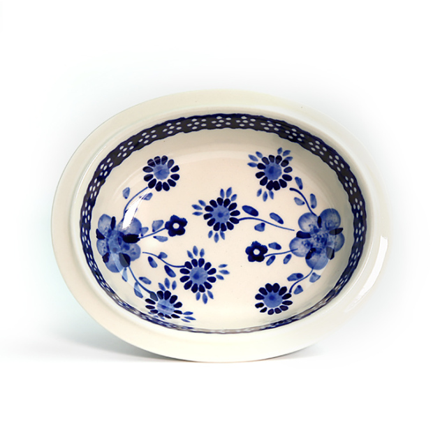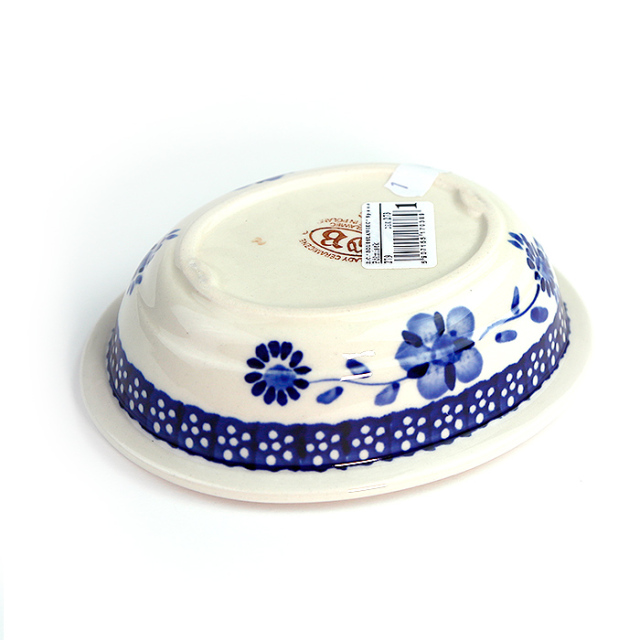 この花の模様は、実は歴とした伝統あるパターンデザインです。白地に青色の花の濃淡が映える仕上がりは、美しく上品な雰囲気を持っています。クラシック柄においては珍しく、花弁や枝や葉はスタンプではなく絵筆が多用されているため、同じ柄でも一つ一つが異なる唯一無二のポーリッシュポタリーの特長を強く味わえます。