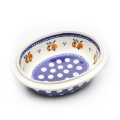 ポーリッシュポタリーの伝統的な「ピーコックアイ」から派生したザクワディらしいクラシック柄のバリエーション。オレンジ色の果実は実はりんご。ポーランド人なら誰しも間違いなくそう答えます。素朴で温かみのあるパターンデザインです。
